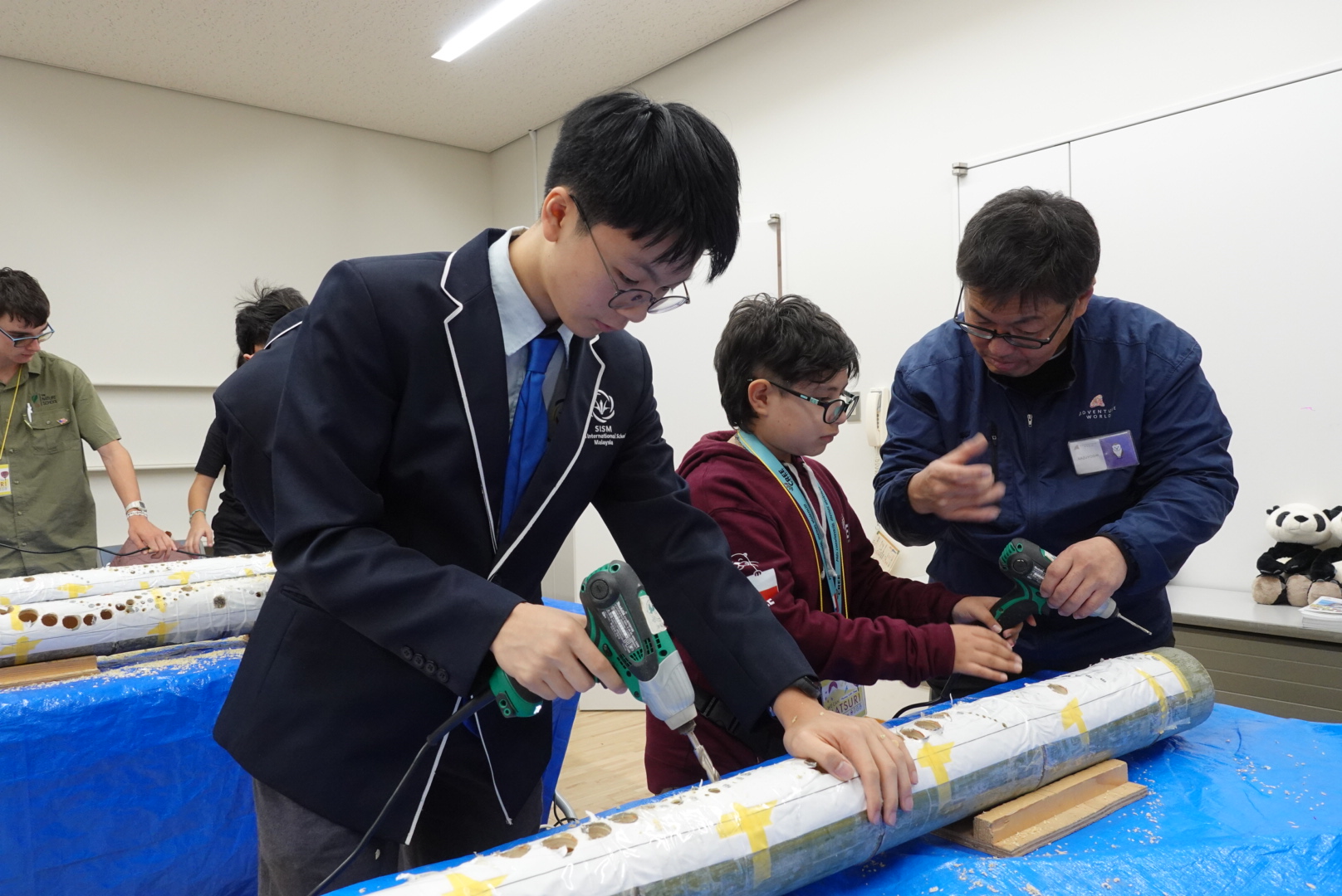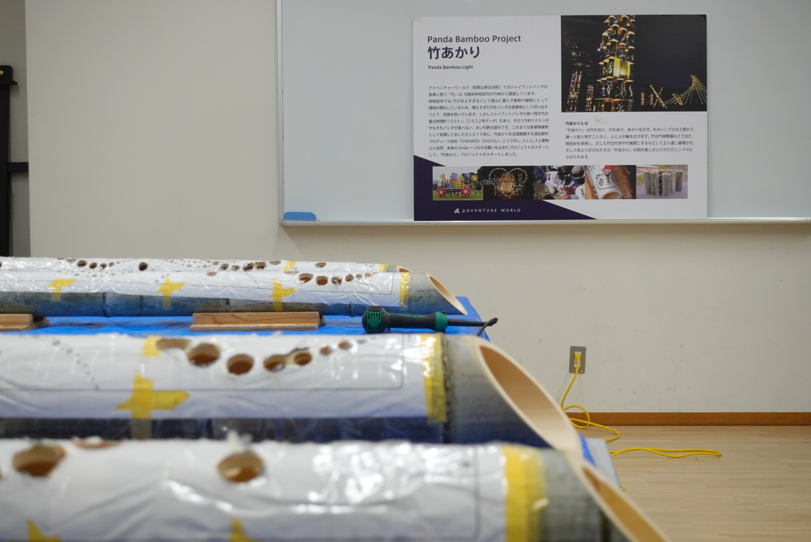 ワークショップでは、里山の環境保全と竹資源の循環活用を目指すアドベンチャーワールドの「パンダバンブープロジェクト」について英語で紹介し、参加者は高さ約1.6mの孟宗竹にドリルで穴を開ける竹あかり制作に挑戦しました。