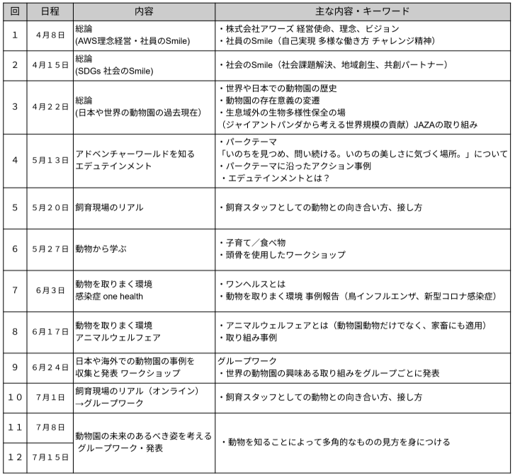 全14回の講義において、アドベンチャーワールド経営幹部や現場で活躍するスタッフが特別講義を行います。